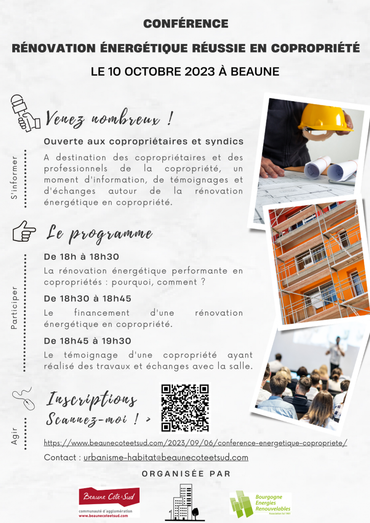 En partenariat avec la Communauté d’Agglomération de Beaune Côte et Sud, nous convions les copropriétaires, leurs syndics professionnels et bénévoles, et tous les acteurs de ce territoire intéressés par ce sujet à  venir s’informer sur la rénovation énergétique performante en copropriété.
